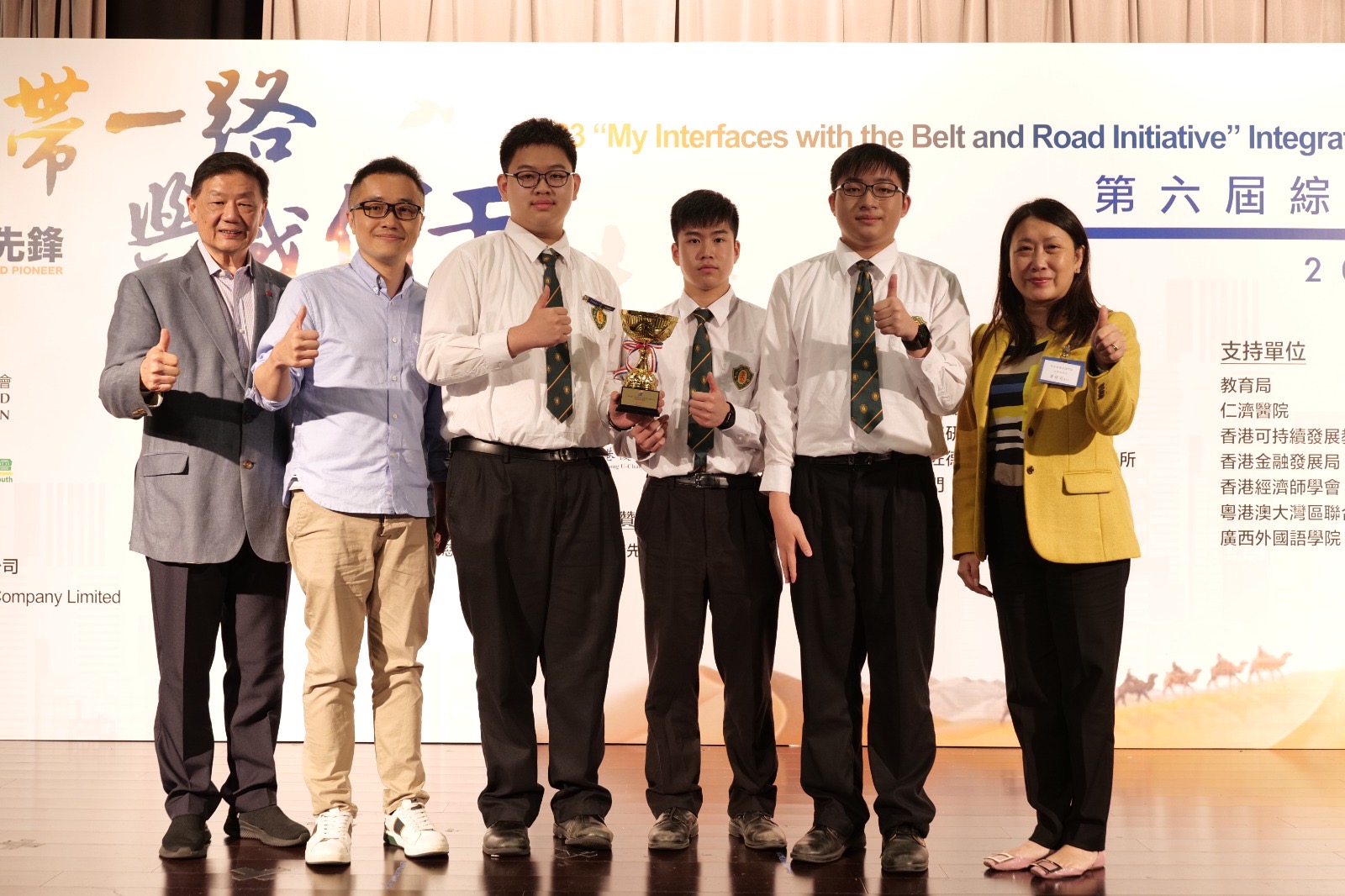 三位同學先於上午進行的「一帶一路倡議」、「粵港澳大灣區」問答比賽順利晉級,再於下午完成有關「粵港澳大灣區」科創發展的專題演示,最終於校際中學組榮獲亞軍,並授予「帶路先鋒大使」榮譽。同學將以大使身分,積極推廣「一帶一路倡議」、「粵港澳大灣區」。