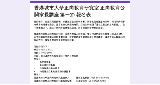 香港城市大學正向教育研究室一直致力推廣正向教育,曾合作過的學校及機構已超過300間,為了將團隊所累積的經驗貢獻社會,研究室將會定期舉辦網上家長講座,運用正向心理學的理論和方法,讓家長們建立正向的家庭教養。
