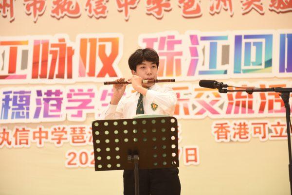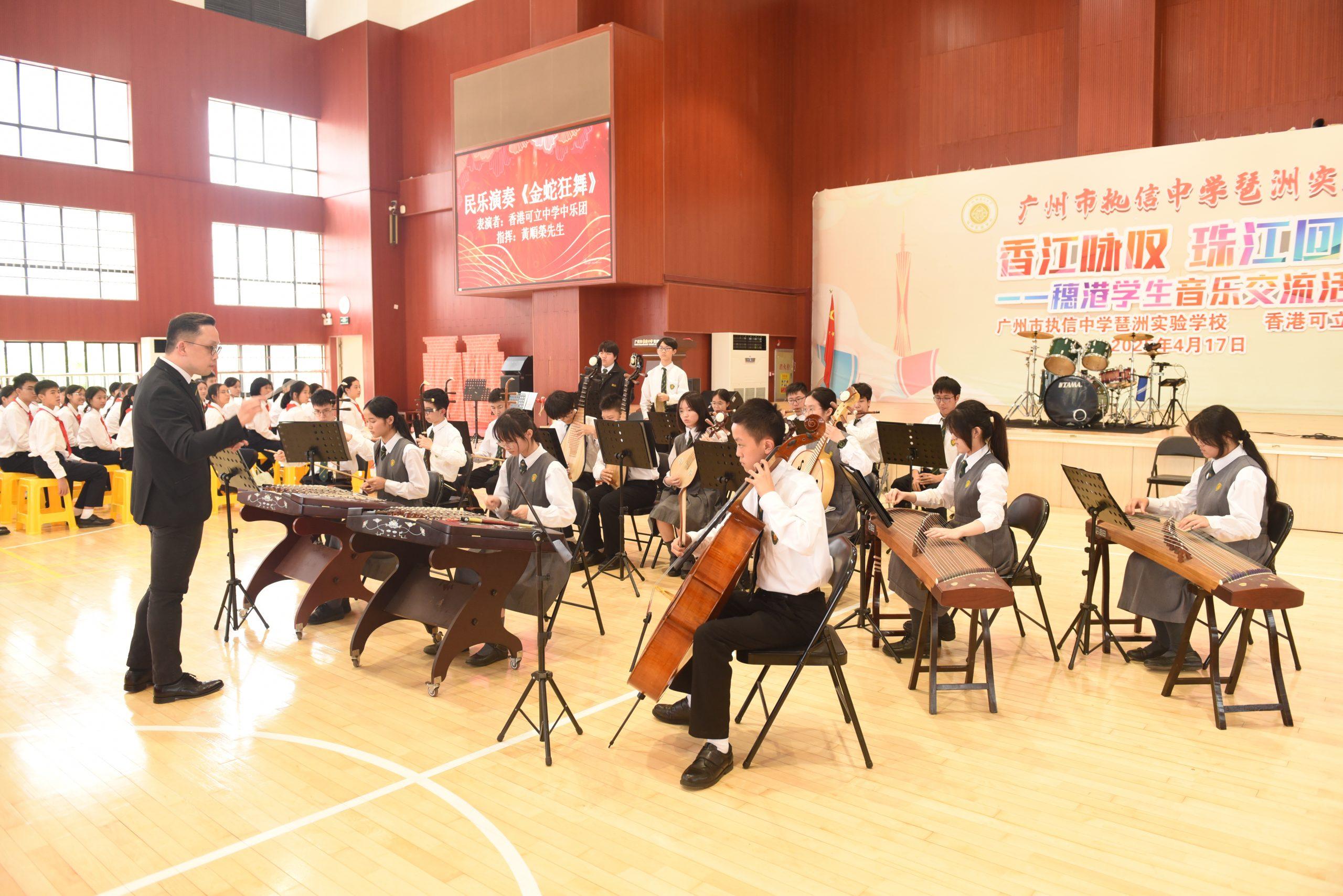 In the afternoon, we gathered in our school’s gymnasium and jointly performed the “Ode to Hong Kong, Echoes of the Pearl River” music exchange concert. On stage, our school’s Chinese orchestra opened the concert with a piece, “Golden Snake Dance.” Subsequently, classic pieces such as “Shaanbei Lyric,” “The Sun is Red Over Jinggang Mountain,” “Ju Ju Shuang,” “General’s Order,” “Thunder in the Drought,” and “Golden Pasture” were performed in succession, blending Chinese and Western styles, full of charm, and showcasing the unique allure of Guangzhou and Hong Kong music.