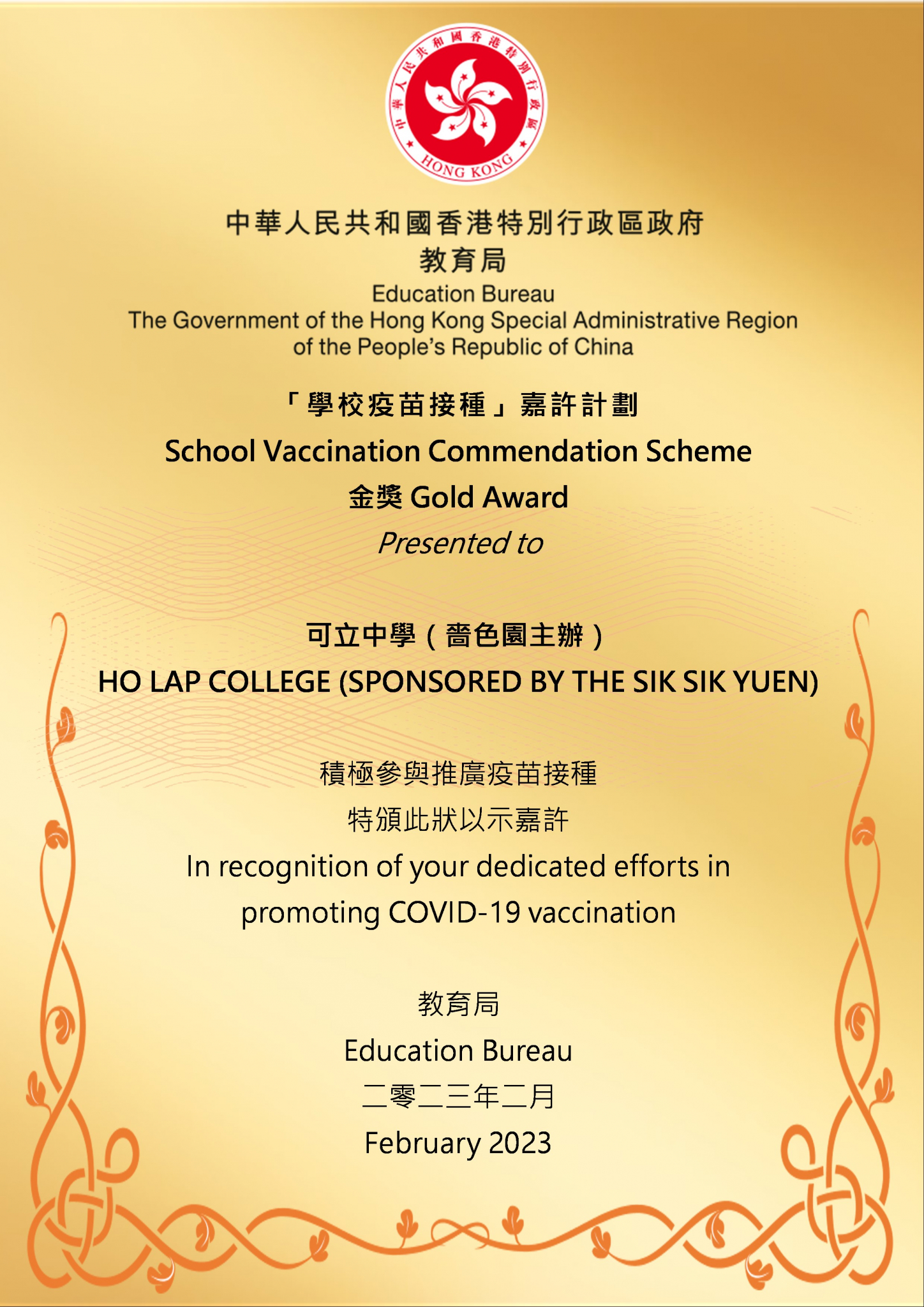 School Vaccination Commendation Scheme: Gold Award (Feb, 2023)